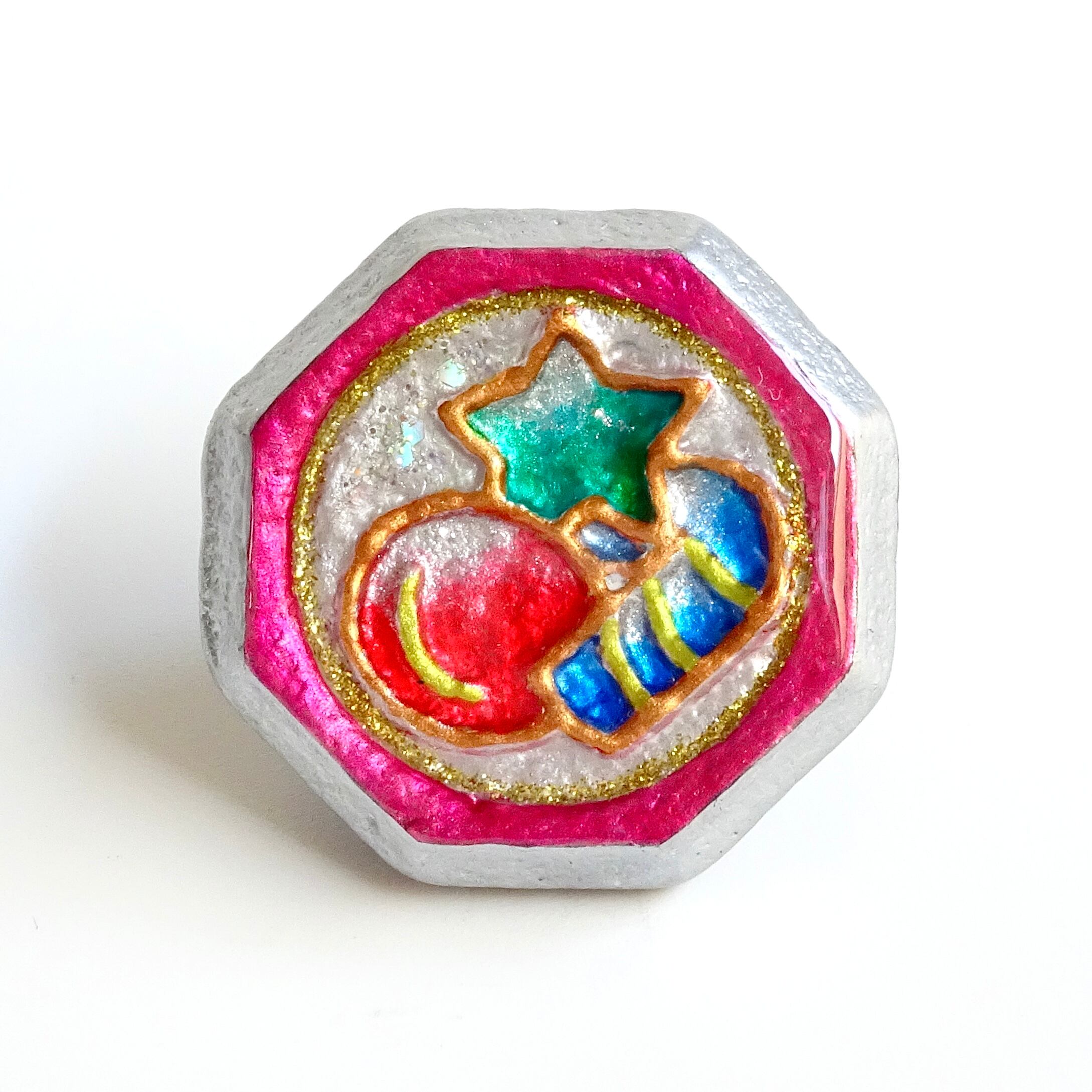 ノーマルベーゴマに一つ一つ丁寧にデコレーションを施し、透明樹脂コーティングをしてあります。